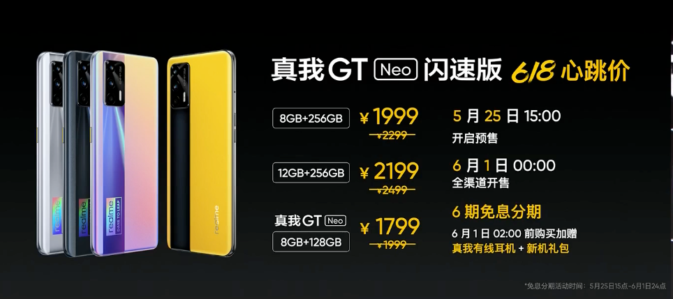 realme真我GT Neo闪速版没有128GB版本,8+256GB售价2299元,12+256GB售价2499元,现已开启618预售促销,8+256GB首销价1999元,12+256GB首销价2199元。