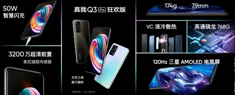 -realme真我Q3 Pro狂欢版:主打可能是同价位最轻薄、骁龙768G处理器的5G手机,6.43英寸2400*1080分辨率三星AMOLED左上角单挖孔直屏,120Hz屏幕刷新率+360Hz触控采样率,光学屏下指纹,塑料机身,机身三围158.5*73.3*厚8.1mm,塑料机身,重174g,黑巧森林、天空之城2个配色。