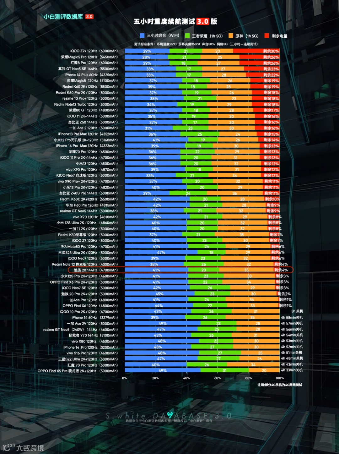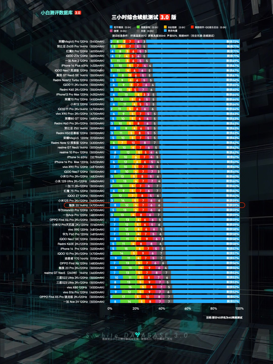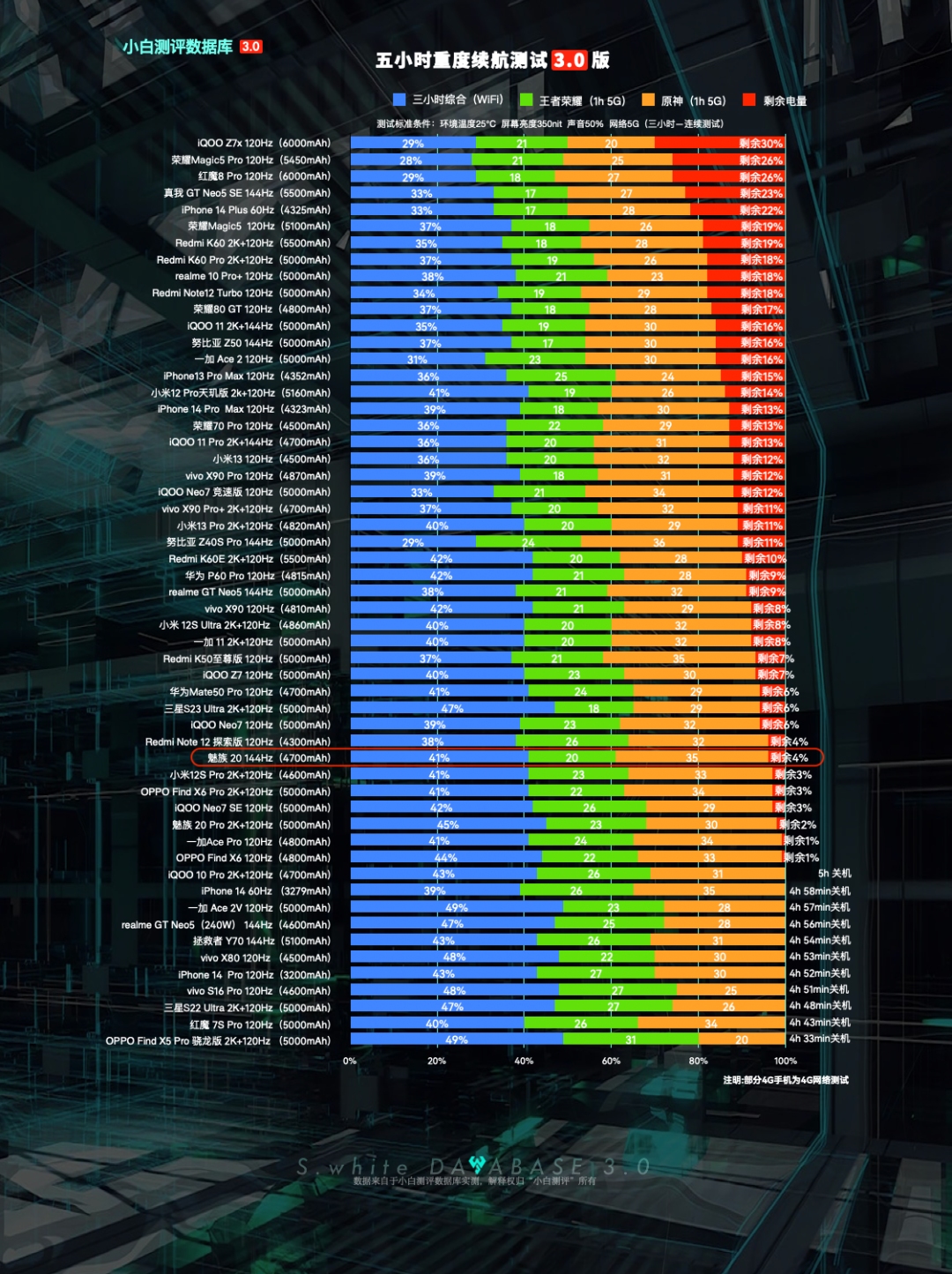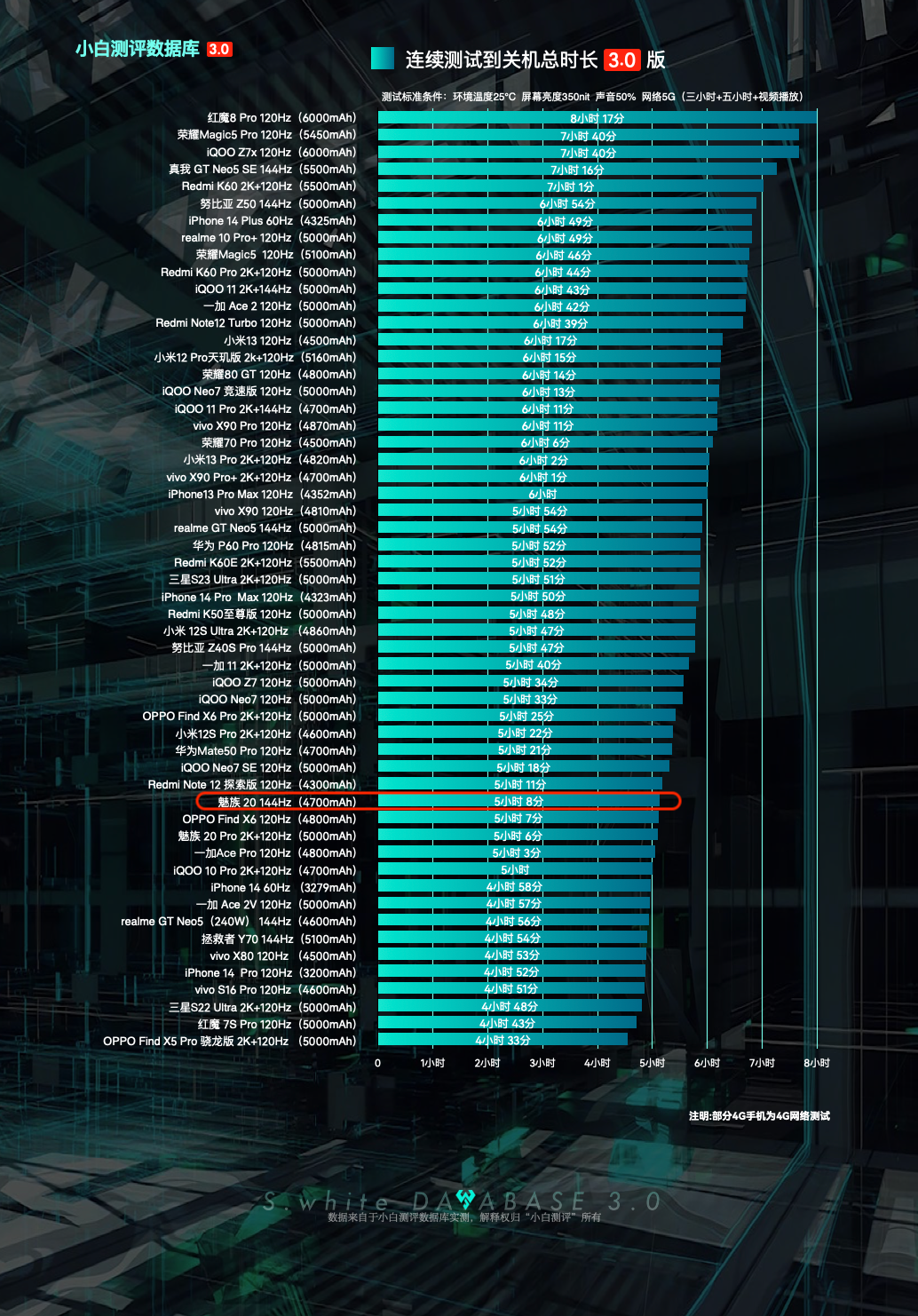 魅族20续航实测:4700mAh电池,1080P,144Hz刷新率,三小时综合续航模型电量剩余59%。五小时重度续航模型电量剩余4%,极限续航测试直到关机共用时5小时8分钟。(*配图榜单仅代表目前小白测评数据库3.0模型下已测试机型的陈列展示,不代表机圈所有手机排行)