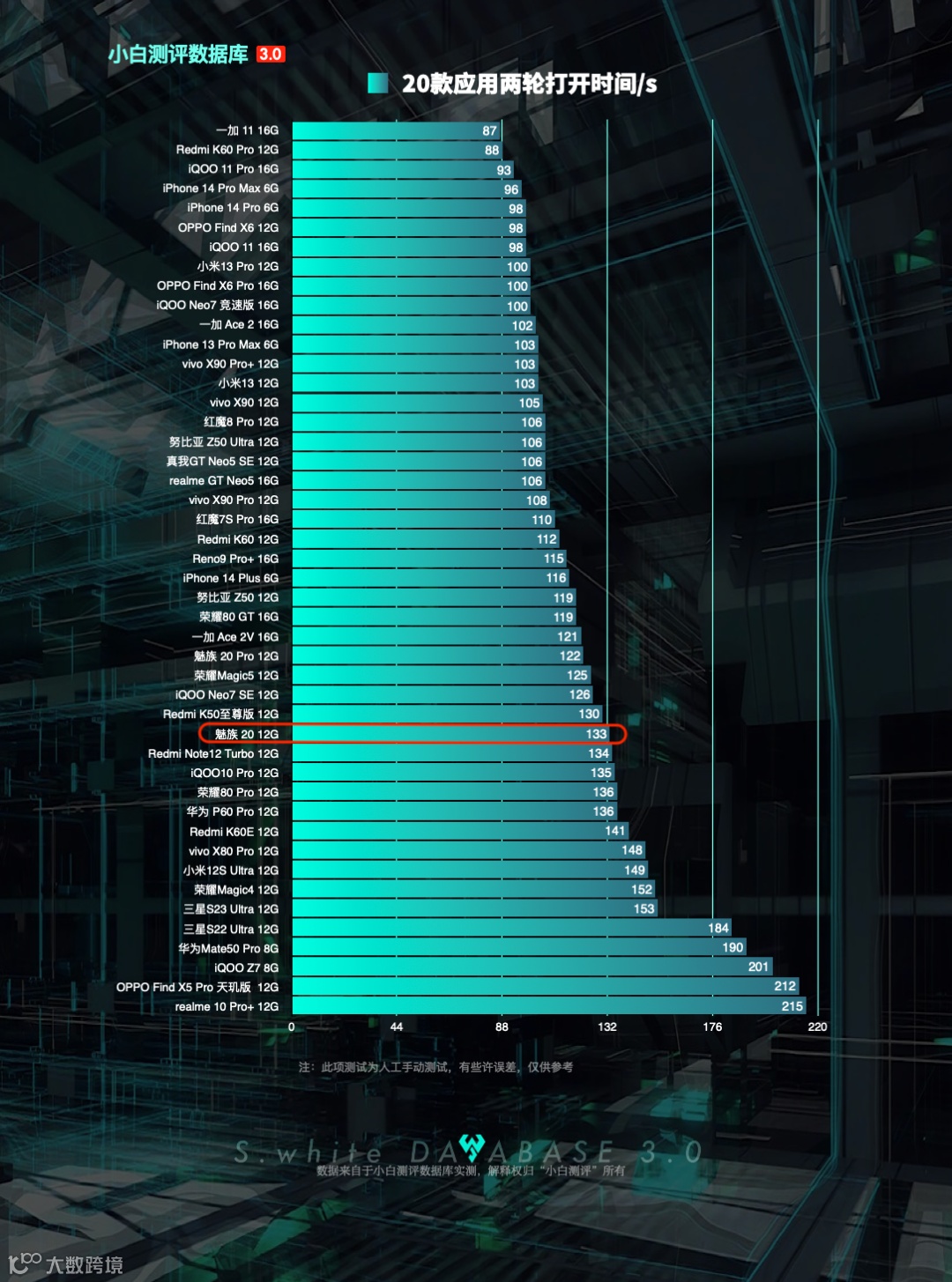 魅族20综合体验实测:20款应用两轮打开用时133秒,第二轮打开零杀后台。(测试内存:12GB)(*配图榜单仅代表目前小白测评数据库3.0模型下已测试机型的陈列展示,不代表机圈所有手机排行)