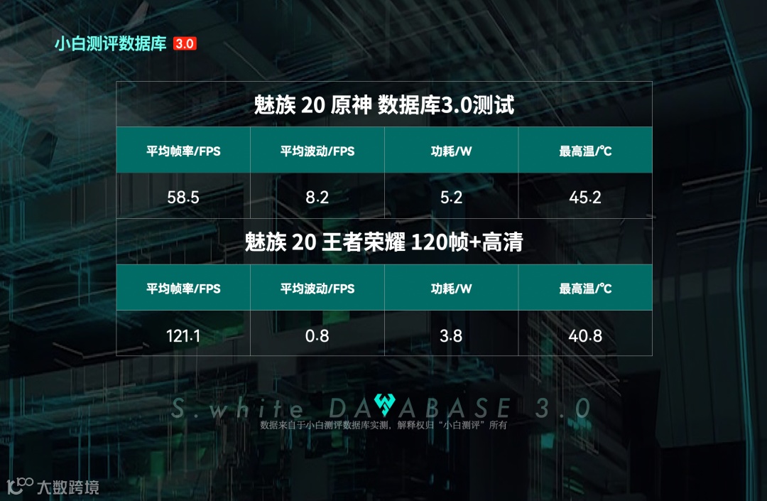 魅族20游戏实测:数据库3.0模型《原神》测试,平均帧率58.5 FPS,功耗5.2 W,机身最高温度45.2℃;王者荣耀120帧高清,平均帧率121.1 FPS,功耗3.8W,机身最高40.8℃。