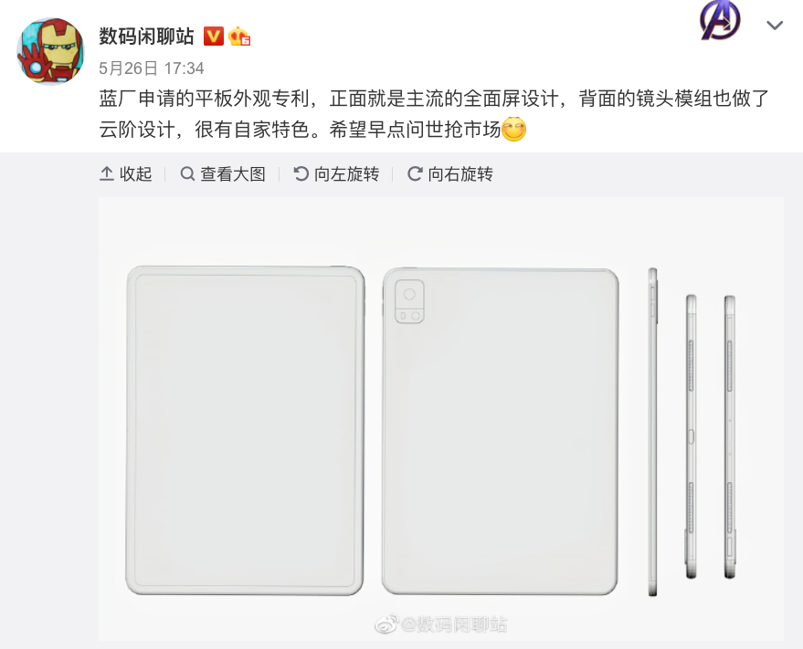 作为补充,除了realme或将推出平板电脑外,vivo、iQOO也有平板电脑相关信息爆料。上图就是前些天曝光的一份vivo平板外观专利,背部相机模组是vivo家族式云阶设计,还蛮有辨识度的。