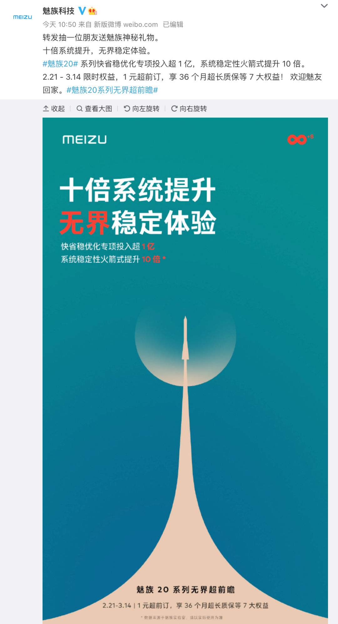 另外今天魅族还更新一张预热海报,称「十倍系统提升,无界稳定体验。魅族20系列快省稳优化专项投入超1亿,系统稳定性火箭式提升10倍。」1元预订能享权益也能后期不想买再退款,不知道有多少小伙伴参与了