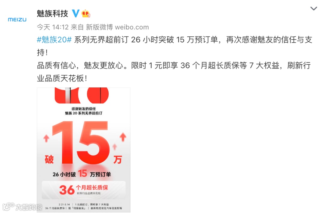 魅族表示魅族20系列无界超前订26小时已突破15万预订单,再次感谢魅友的信任与支持。