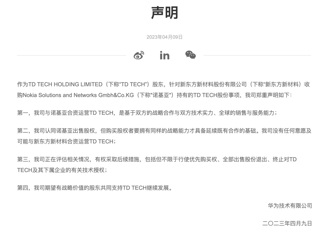 华为声明表示:「我司没有任何意愿及可能与新东方新材料合资运营TD TECH;正在评估相关情况,有权采取后续措施,包括但不限于行使优先购买权、全部出售股份退出、终止对TD TECH及其下属企业的有关技术授权」。