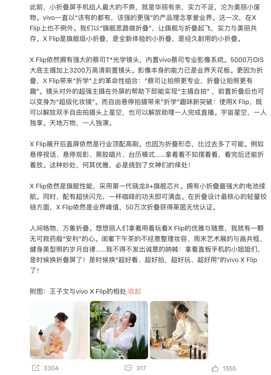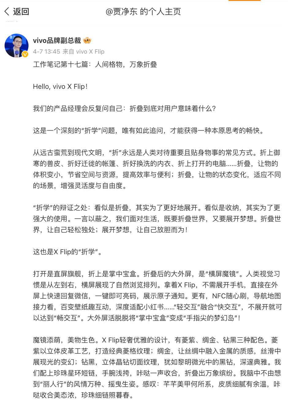 配置上,其称X Flip是旗舰级小折叠,是全新体验的小折叠,是经久耐用的小折叠。内置vivo蔡司专业影像系统,5000万OIS大底主摄、3200万高清前置镜头,支持自由悬停拍摄、悬停视话、悬停观影、黑胶唱片、台历模式等;展开后是一块行业顶配高刷直屏;采用第一代骁龙8+旗舰芯片,拥有小折叠最强大的电池续航,同时配有超快闪充,50万次折叠获得莱茵无忧认证。