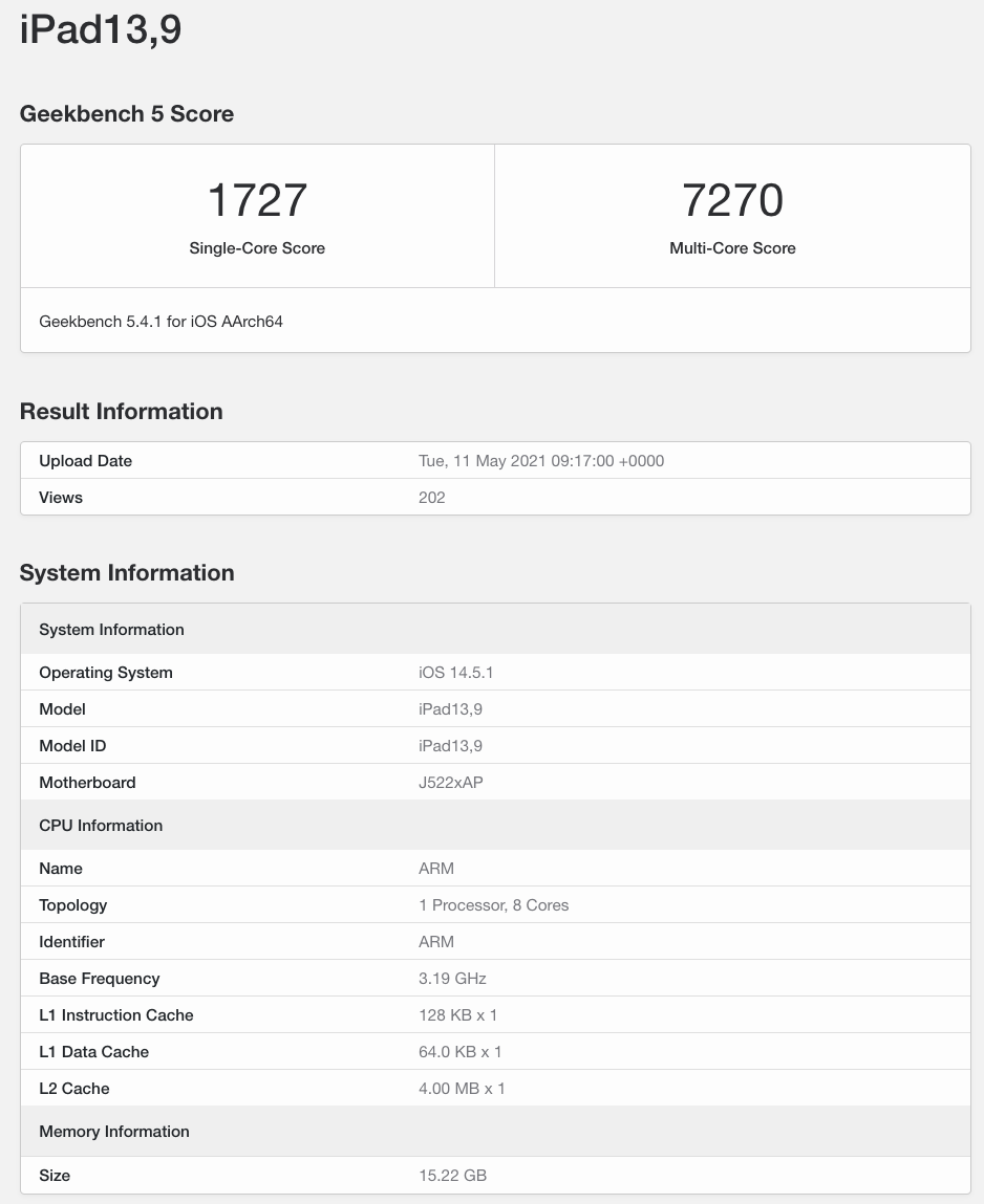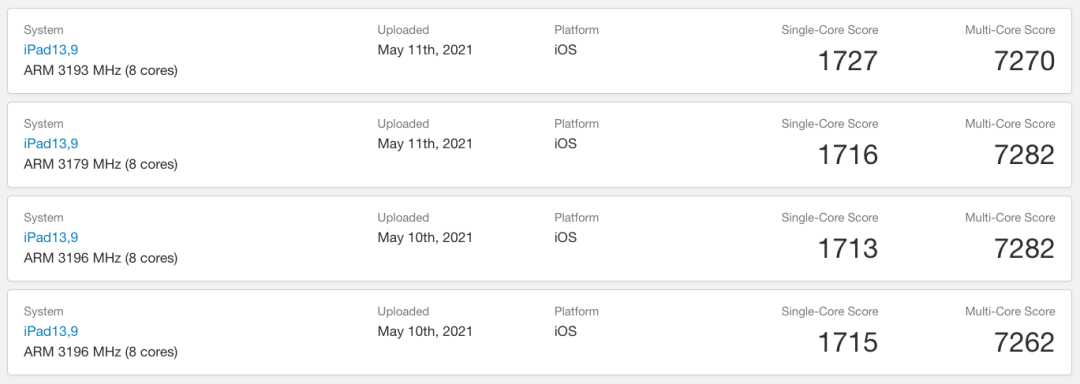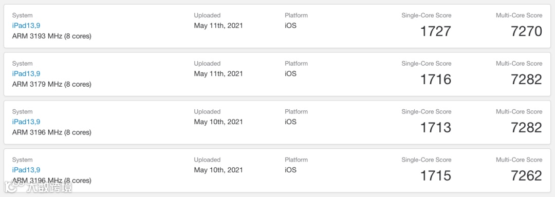 随便选取了一组,可以看到测试跑分的这台M1 iPad Pro内置16GB内存,搭载14.5.1系统。作为补充,目前安卓这边的骁龙888旗舰Geekbench 5单多核跑分是1100+/3750左右,M1的iPad Pro多核跑分直接是其2倍左右。