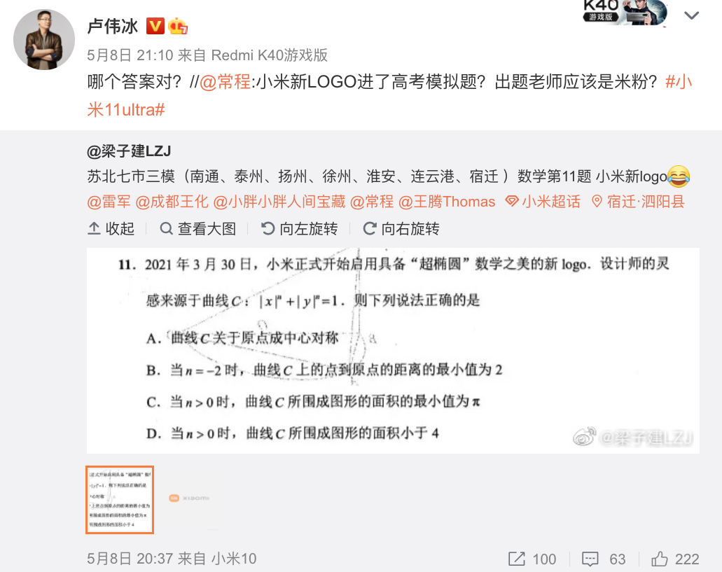 2021年3月30日在小米春季新品发布会上,雷军宣布「新十年,新形象!今天,小米发布全新LOGO,开始升级品牌识别系统。」即小米品牌logo进行更换,但这个新logo引起了热议,还一度因被吐槽上了热搜,近日被发现又现身某地区的高考数学模拟试卷中。
