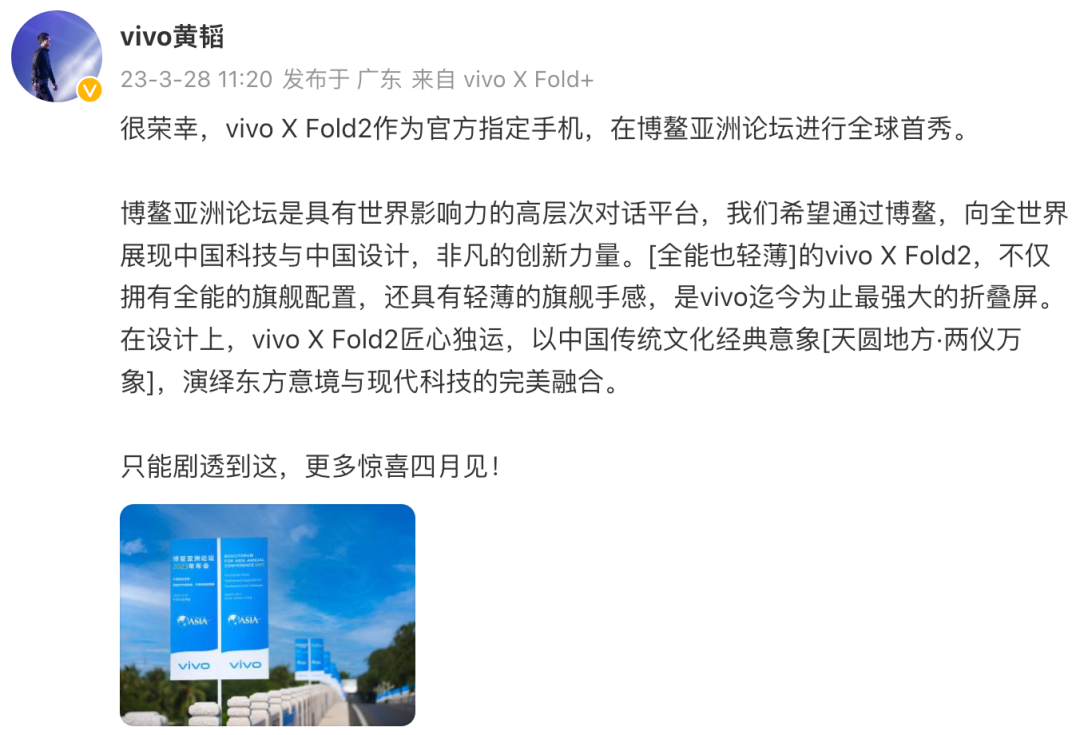 vivo产品线副总裁黄韬在微博透露:vivo X Fold2作为官方指定手机,在博鳌亚洲论坛进行全球首秀。并透露:“vivo X Fold2「全能也轻薄」,不仅拥有全能的旗舰配置,还具有轻薄的旗舰手感,是vivo迄今为止最强大的折叠屏。在设计上,vivo X Fold2匠心独运,以中国传统文化经典意象「天圆地方·两仪万象」,演绎东方意境与现代科技的完美融合。更多惊喜四月见!”