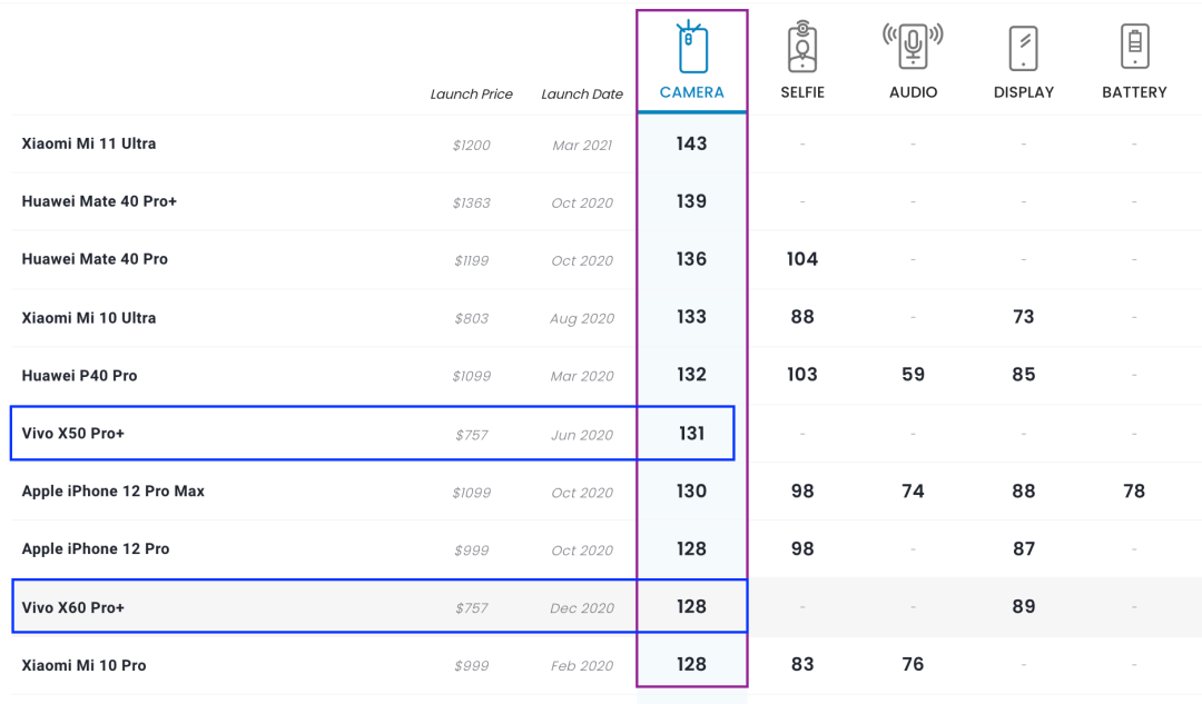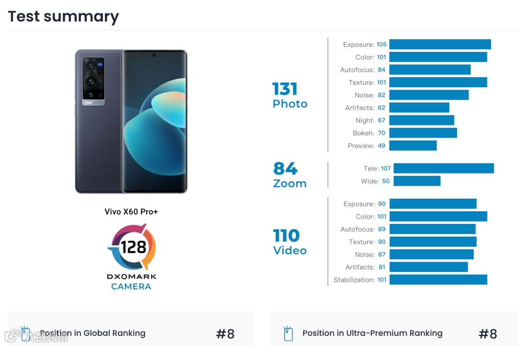 DxOMark表示其测试的vivo X60 Pro+后置相机综合成绩128分,具体拍照单项131分,变焦单项84分,视频单项110分。