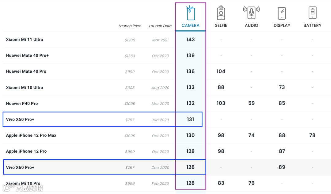 略微尴尬的是,vivo X60 Pro+在DxOMark后置相机榜单中排名比上代X50 Pro+还落后几名,综合成绩也低了3分。