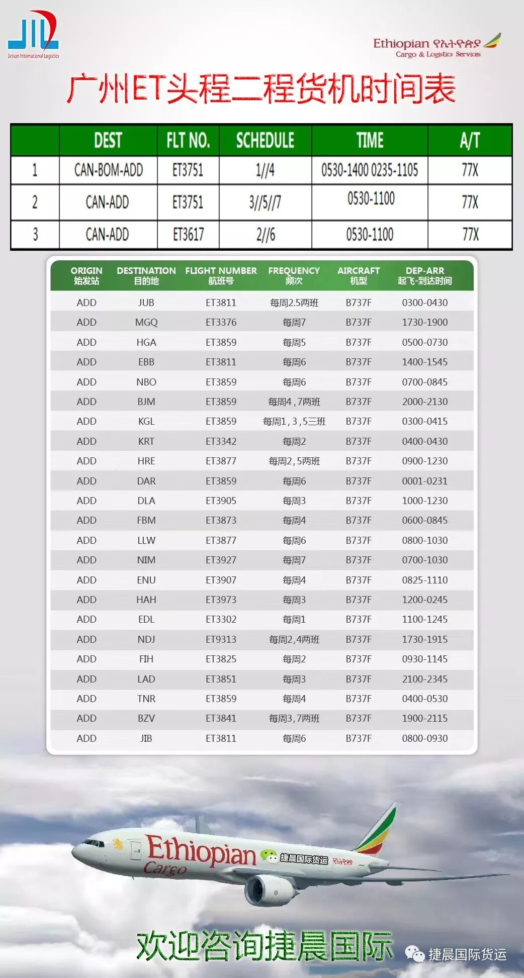 导读:埃航(ET)二程转运力大大提升,大部份国家每周有全货机执飞广州出头程更是Daily全货机