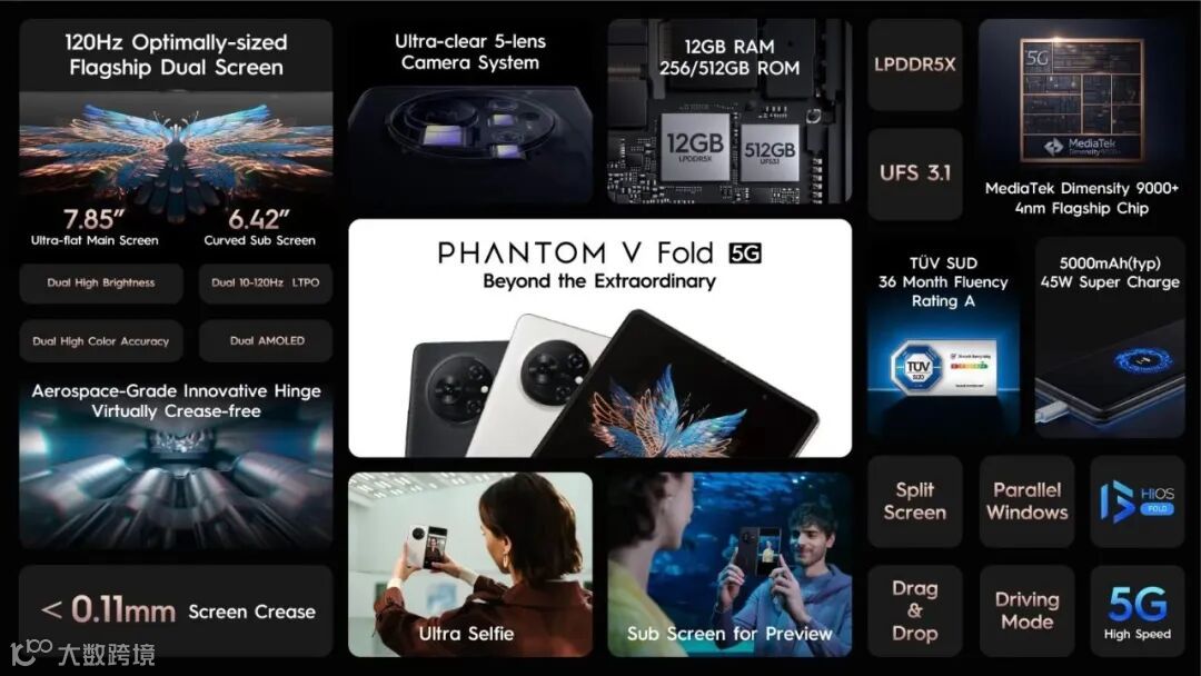 核心配置上,Tecno Phantom V Fold搭载联发科天玑9000+,配备 5000mAh电池、45W有线充电(不支持无线充电);外屏前置32MP,内屏前置16MP,后置三摄50MP主摄+50MP 2X+13MP超广角,相机模组呈居中奥利奥造型。