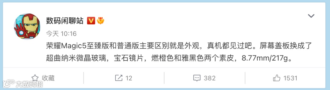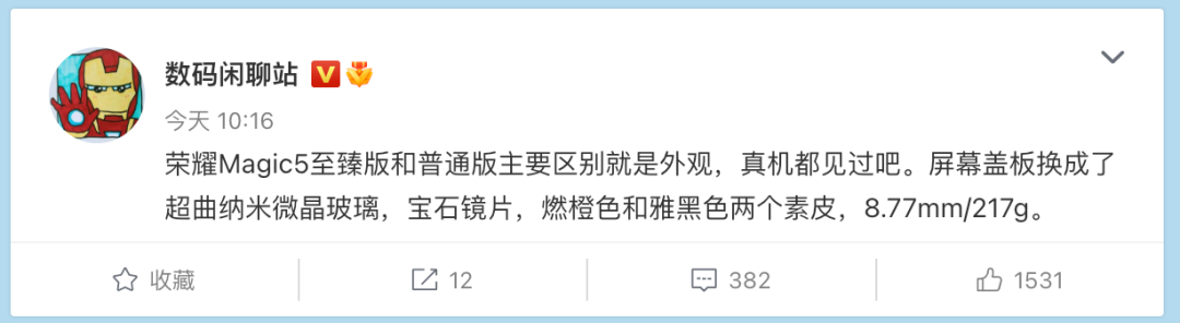 据数码闲聊站爆料,荣耀Magic5至臻版和普通版主要区别在于外观,屏幕盖板换成了超曲纳米微晶玻璃,宝石镜片,提供燃橙色和雅黑色2个素皮版本,机身厚约8.77mm,重约217g。