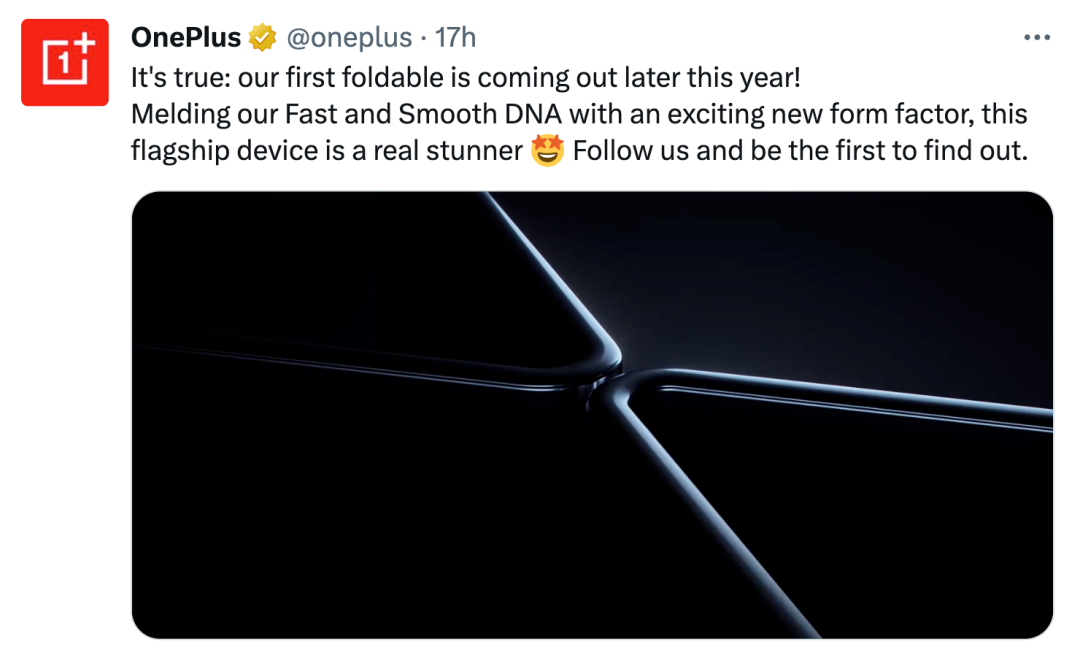据一加官方账号预热:“一加的第一款折叠屏手机将于今年晚些时候面世!这款旗舰设备将我们快速流畅的DNA与令人兴奋的新外形融合在一起”。