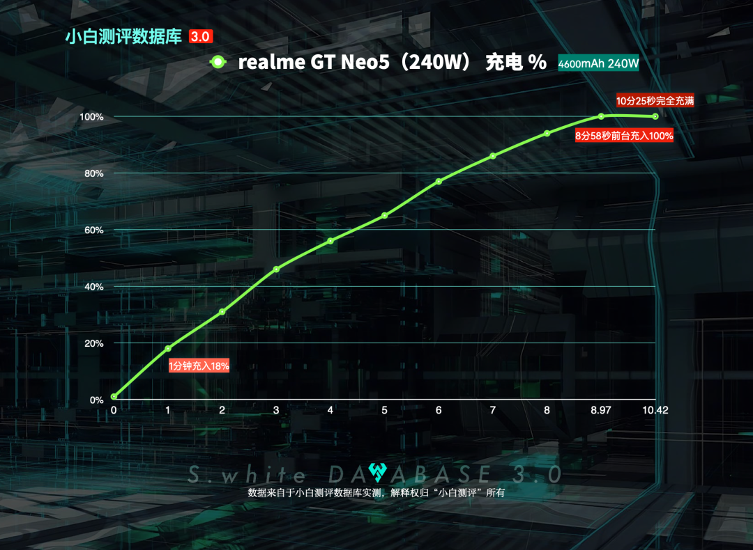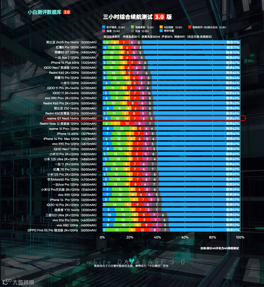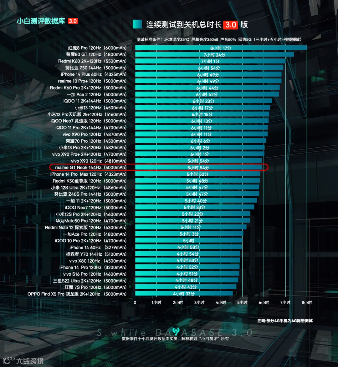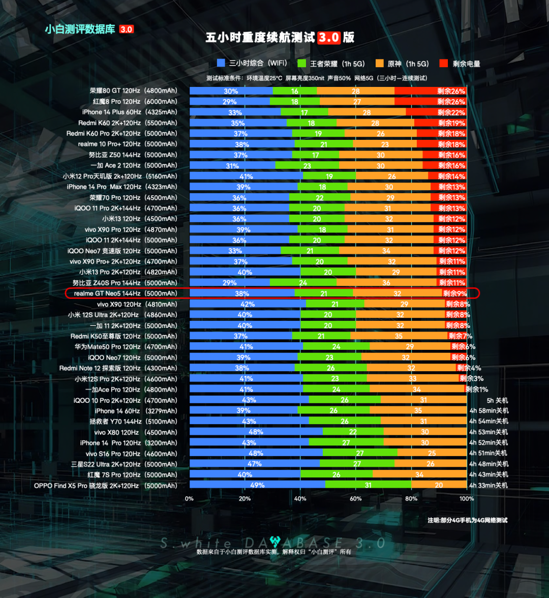 以上数据基于小白测评数据库3.0模型进行测试,测试标准条件:环境温25℃±0.5℃,屏幕亮度350nit,声音50%(数据基于真我GT Neo5测试时最新版 realme UI 4.0 RMX3706-11-A.17系统测试)(*配图榜单仅代表目前小白测评数据库3.0模型下已测试机型的陈列展示,不代表机圈所有手机排行)