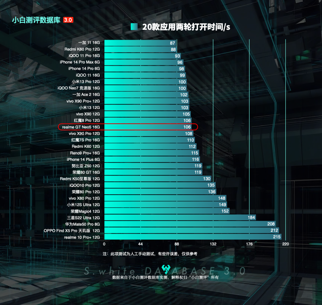 真我GT Neo5流畅度:20款应用两轮打开时间102秒,第二遍打开应用零杀后台(*此项为人工手动测试,仅供参考);(*配图为目前小白测评数据库3.0模型下已测试机型的陈列展示,不代表机圈所有手机排行)
