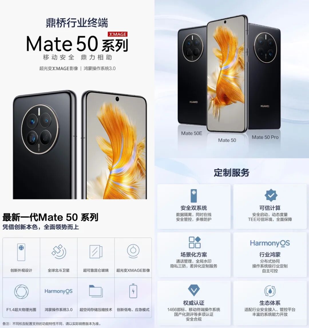 从鼎桥官方海报来看,鼎桥行业终端Mate50系列有Mate 50E、Mate50、Mate50 Pro三款机型,外观和华为Mate50系列一模一样,背部logo也是华为,同时搭载昆仑玻璃、XMAGE影像、内置鸿蒙3.0系统、支持超空间存储压缩技术等。