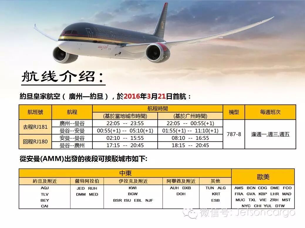 好消息!好消息!好消息!重要的事讲三遍,皇家约旦航空于3月21日广州白云机场首航,路线:广州CAN直飞安曼AMM 经停曼谷BKK,每周三班宽体客机,执飞机型为787,舱位充足。广州市捷晨国际货运代理有限公司有幸成为其指定代理之一,所有乘坐首航的“乘客”均可以享受优惠,欢迎大家踊跃把BOOKING抛过来!