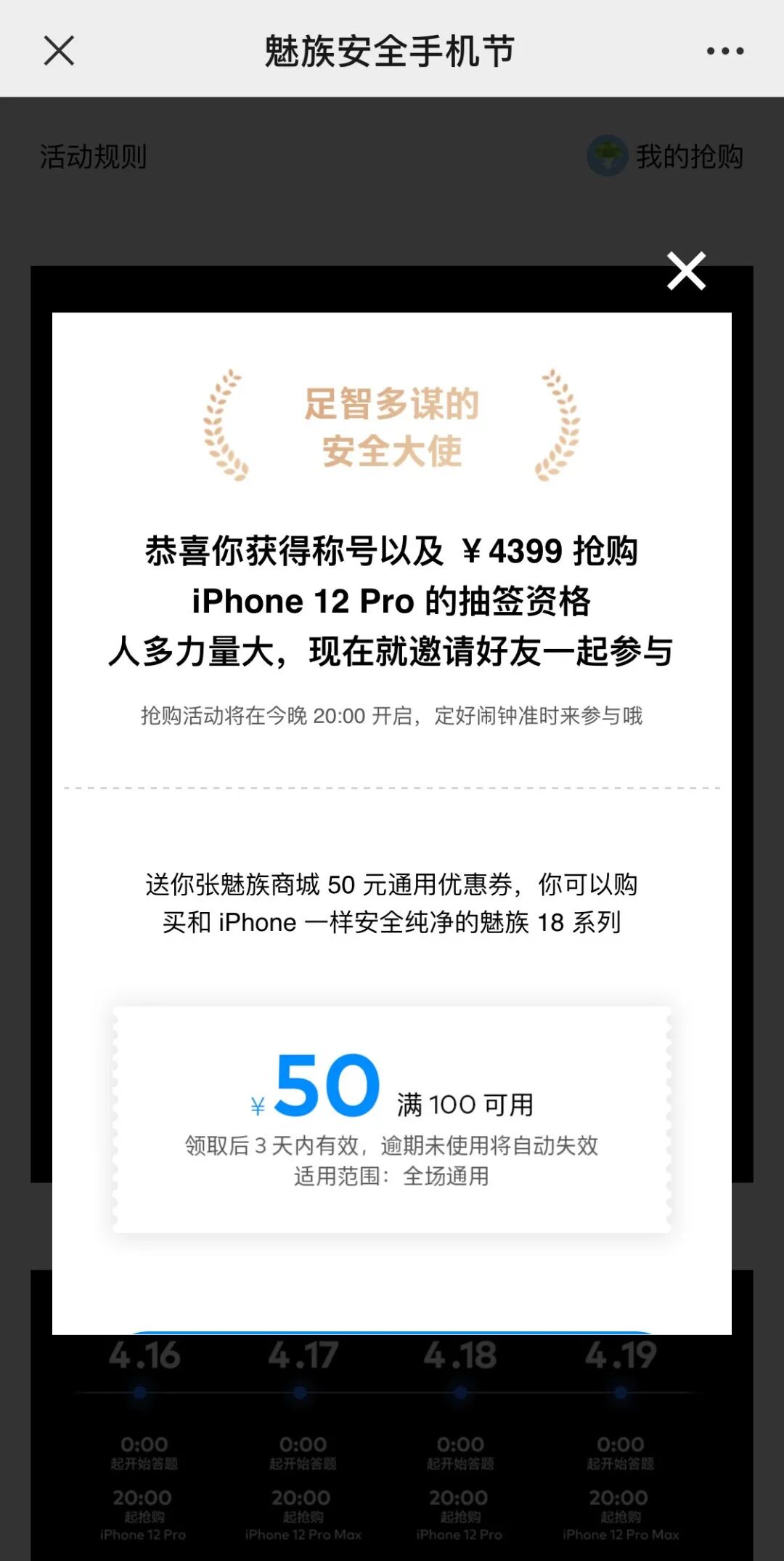 与此同时,搞事情的是魅族还推出了一个5折抢购iPhone 12 Pro的活动,也就是说参加活动就有机会以4399/4999和魅族18/Pro起售价一致的价格买到iPhone 12 Pro/Max,但名额有限,且需要参与抢购资格抽签,小白试了下答对三道题就可以获取抽签资格,但最终能否得到半价购买资格不好说。