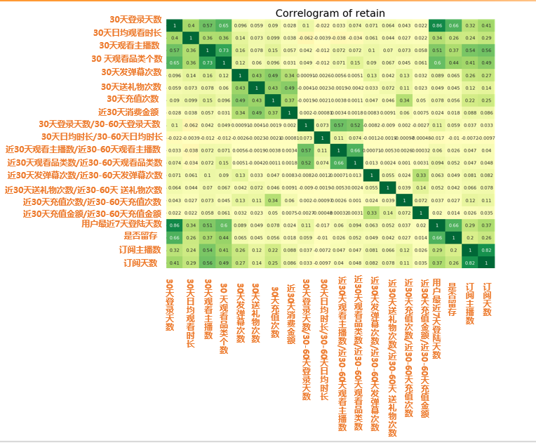 这里的cor 代表每一个行为特征和留存的相关性大小, cor 的值越大代表相关性越大。