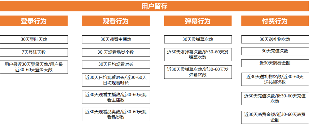 拿某直播app 作为例子, 与留存的相关的行为可以分为 登录行为, 观看行为, 弹幕行为, 付费行为, 然后在每一个大的行为分类进行小的指标的刻画。