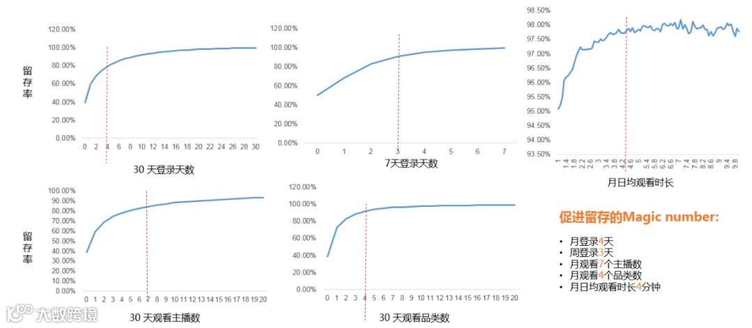这里的aha moment 说明用户在一个月登录4天, 一周登录三天, 月观看7个主播数, 月观看4个品类数, 月日均观看时长4分钟, 会大大提高用户的留存率