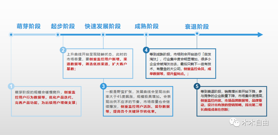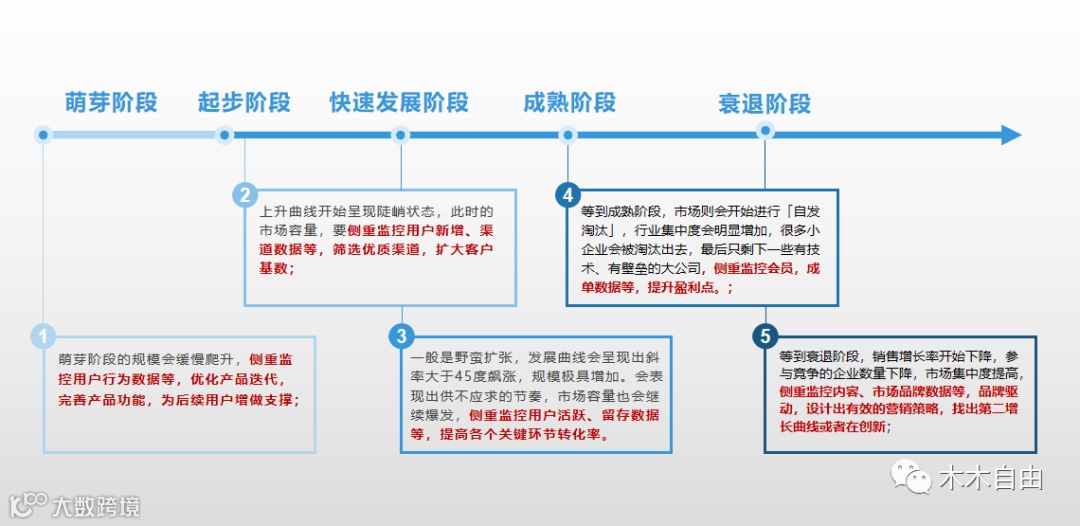 而在产品业务线不同的生命周期阶段,其数据分析侧重的关注点不相同:
