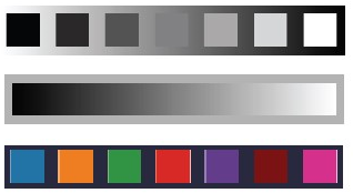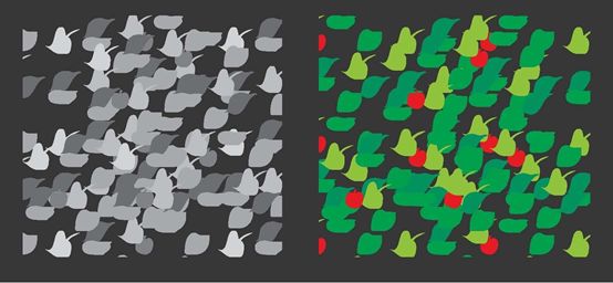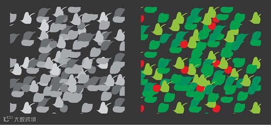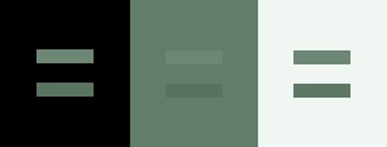 在进行明暗对比时,各种颜色搭配的对比效果:间隔的灰阶>连续的灰阶>多种颜色