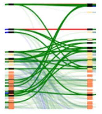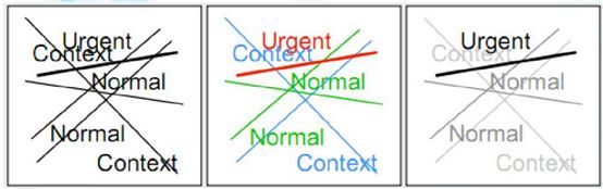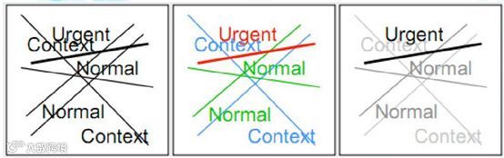 在上图中,需要突出的重点是Ugent,中间的图利用颜色来进行对比,但感觉有些杂乱,但是能够看出图中的线分为了三种类型,最右边的图是利用明暗效果来进行对比,你是不是一眼就看到了Ugent,说明这个对比是成功的。