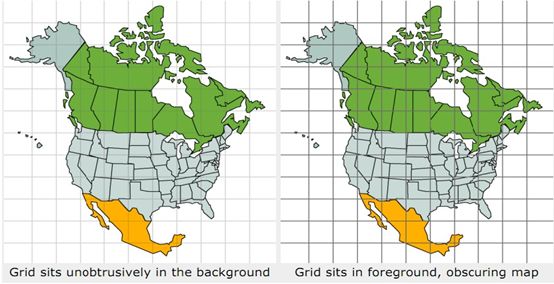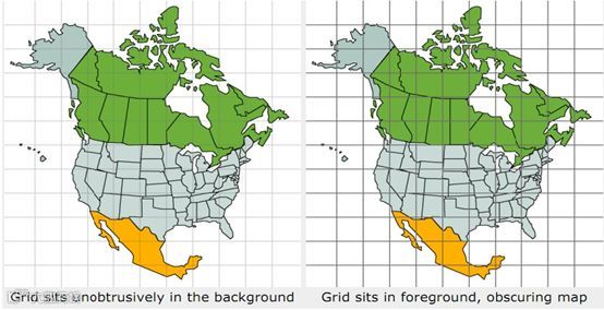 在上面的地图可视化中,右图在左图的基础上增加了一些网格线,这些网格线扰乱了我们的视线,左图明显要更为清楚一些。