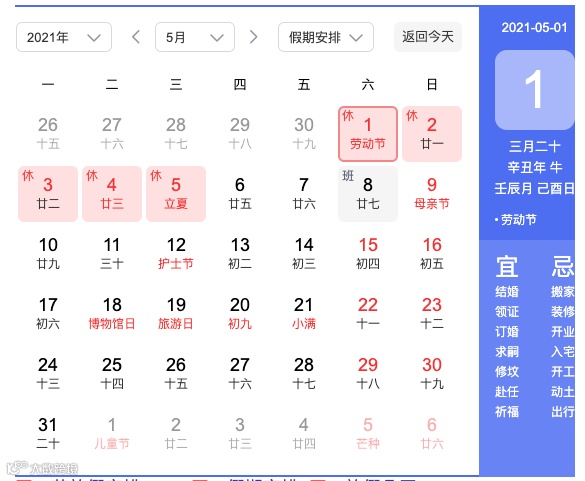 据国务院公布的2021年法定假日放假安排表显示,劳动节:5月1日至5日放假调休,共5天,4月25日(星期日)、5月8日(星期六)上班。以双休的小伙伴视角解读,其实就相当于五一劳动节只额外放了一天假,只是没想到经过科普再一算,实际相当于只放半天假。
