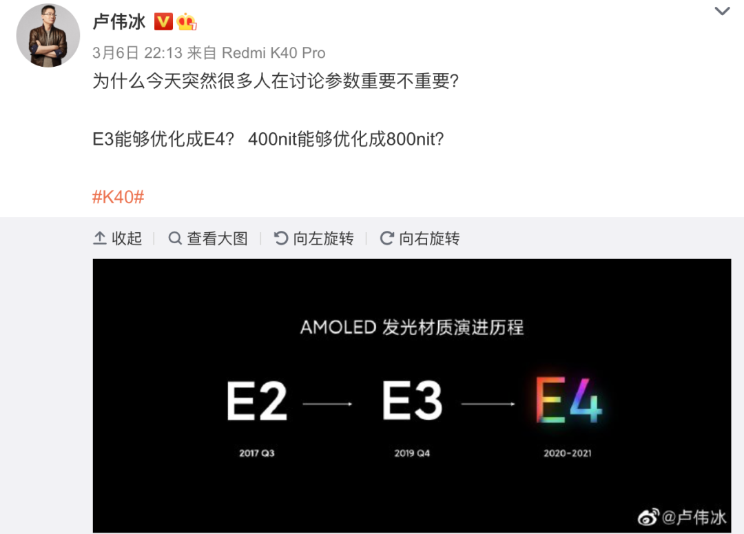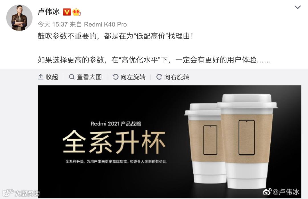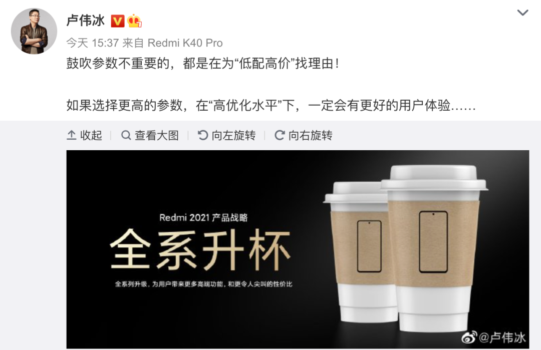 昨天机圈突然掀起了一阵“参数和体验”的争论,卢伟冰也在微博发表了自己的看法。