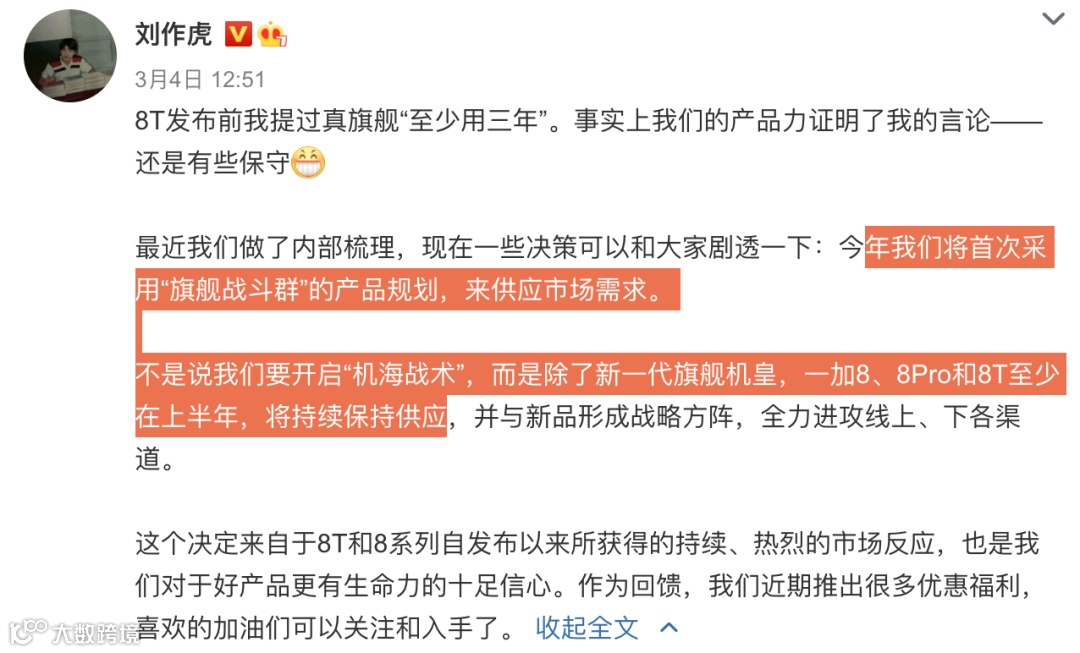 再然后是一加这边,近日一加创始人刘作虎表示,2021年一加将首次采用“旗舰战斗群”的产品规划,即除了新一代旗舰机皇一加9系列,一加8、8Pro和8T至少在上半年,将持续保持供应,并与新品形成战略方阵,全力进攻线上、下各渠道。