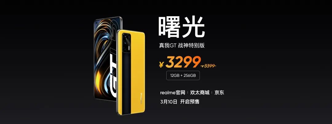 另外就是价格了,realme真我GT 8+128GB首发售价2799元,12+256GB首发售价3299元,目前已开启预售,将于3月10日正式开售;战神特别版曙光配色将于3月10日开启预售。