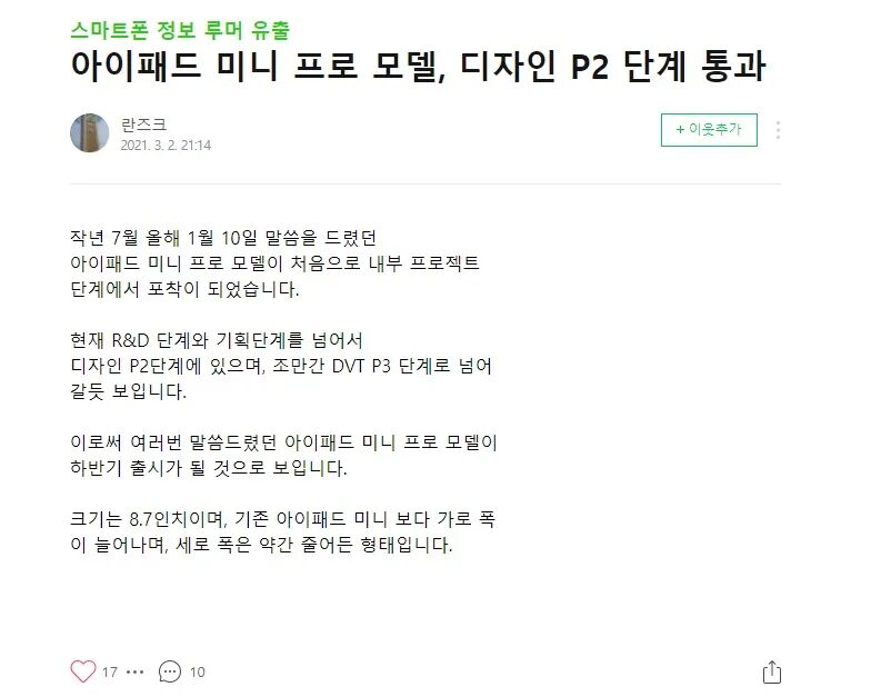 据韩国博客Naver一则爆料称:苹果正在开发名为“iPad mini Pro”的设备,有望在今年下半年推出。其称iPad mini Pro将采用8.7英寸屏,相比现款iPad mini 5主要是机身宽度增加,换言之还是16:9带Home键屏?🤔