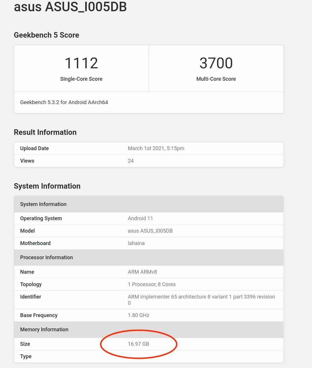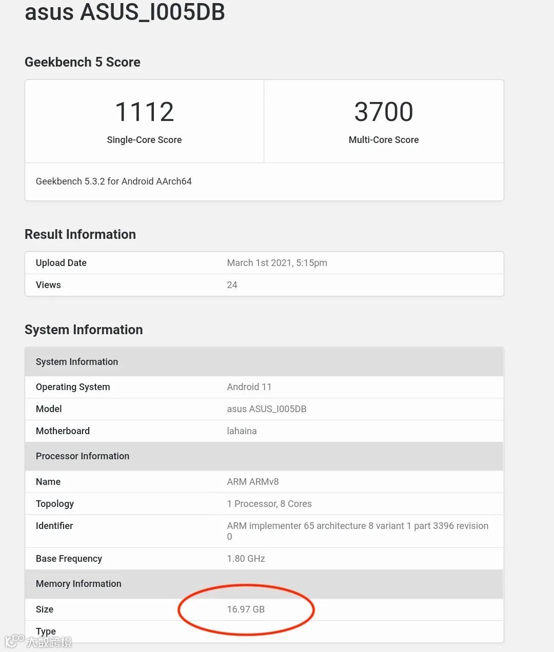 如上图所见,Geekbench跑分库显示型号为asus ASUS_I005DB的华硕ROG 5单核跑分1112,多核跑分3700,搭载骁龙888处理器,预装Android 11,本内置18GB超大杯运存。换言之ROG 5这次最大版本顶配应该就是18GB大运存版。