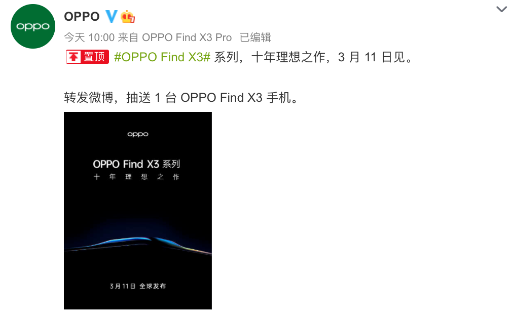 虽然周末的时候已经被天猫提前泄露,但OPPO Find X3系列直到今天才迎来了正式官宣:3月11日下周四晚上19:30发布会。