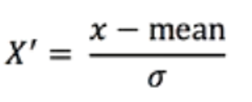 2)标准化处理:这里只介绍一种经常使用的 z-score 标准化,经过处理后的数据均值为 0,标准差为 1,符合标准的正态分布。其中 mean 为平均值,б 为标准差。