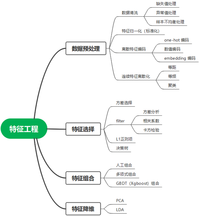 数据预处理是特征工程的最重要的起始步骤,主要包括数据清洗、特征归一化、特征编码、特征离散化等。