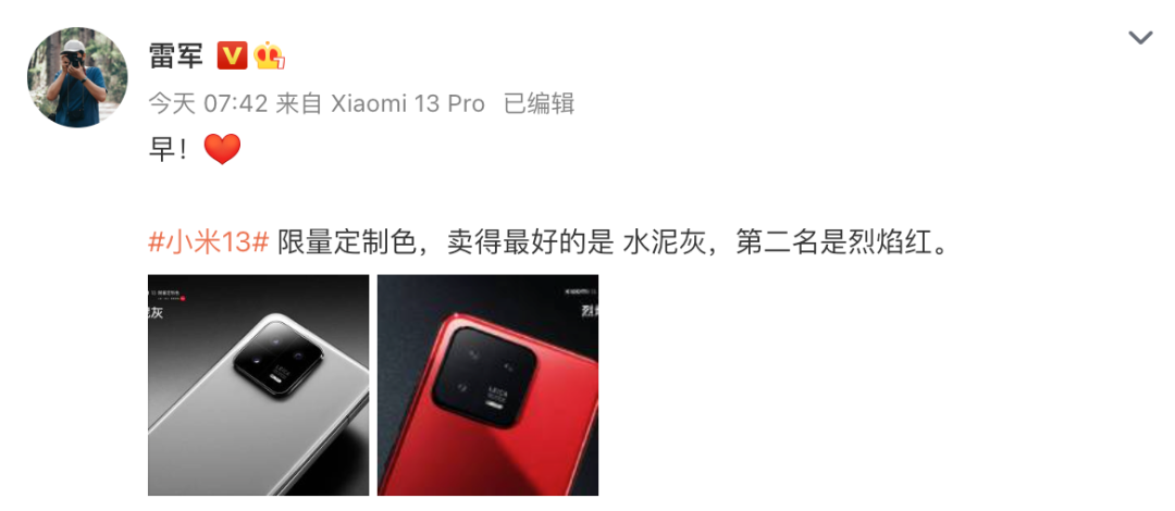 【行情】小米13五个限量定制色 雷军:水泥灰卖得最好