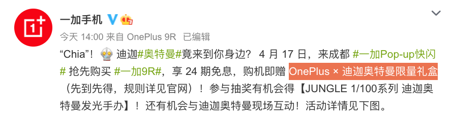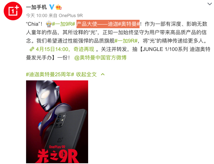 日前一加预热了一则和迪迦奥特曼的神秘海报,今天正式揭晓。