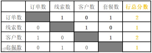 用每一行和列的项目对比,例如第一个格子,订单数和订单数,自己对比自己,没有可比性,格子放黑色;第二个格子,订单数和线索数,订单数更重要,写1;第三个格子,订单数和客户数,客户数更重要,那么订单数不得分,写0;以此类推,最后得出每一行的总分数。在这个记分卡里,重要指标是订单数和客户数,次要指标是线索数和套餐数。