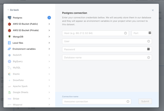 此外,除了从本地上传文件外,还可以与AWS S3、Mongo DB和Postgres集成(至少在我的β测试帐户上)。有很多“灰色”选项,但没看到与Azure存储和GoogleDrive的集成。如果Google Colab用户想随意尝试一下Deepnote,那么有Google Drive集成肯定会少很多麻烦。