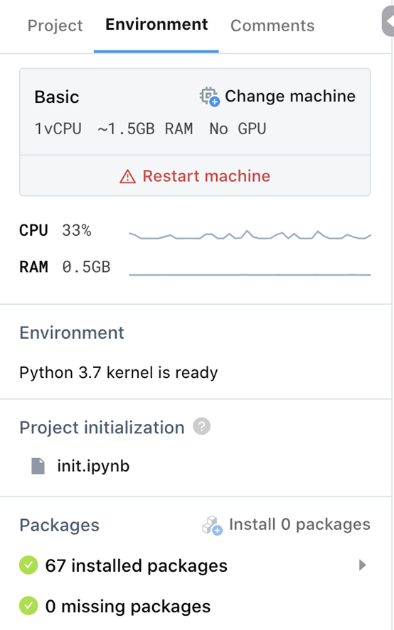 可以利用“环境”选项卡选择机器配置,重新启动它,查看CPU和RAM的使用情况,并检查项目所依赖的包。