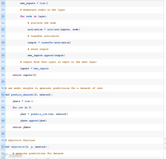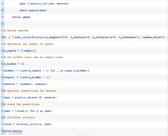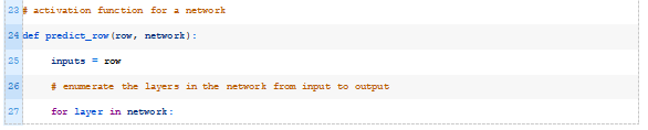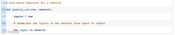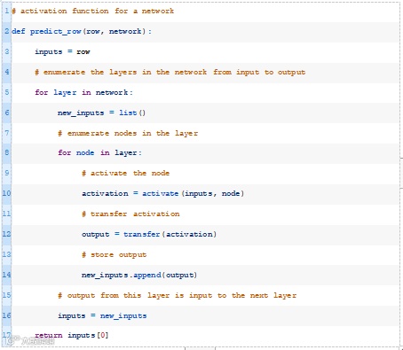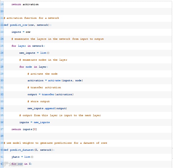 接下来,我们可以一起使用activate()和transfer()函数来生成给定数据行的预测。下面的predict_row()函数实现了这一点。