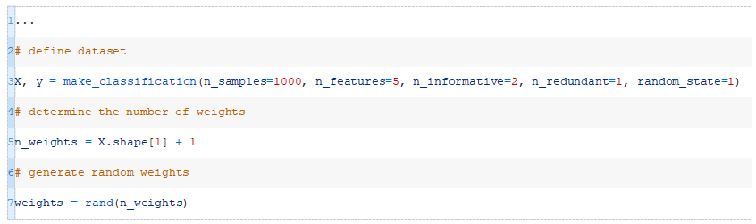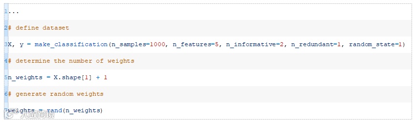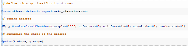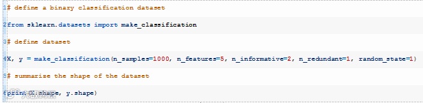 我们可以使用make_classification()(https://scikit-learn.org/stable/modules/generated/sklearn.datasets.make_classification.html)函数定义一个包含1000行和5个输入变量的二分类问题。