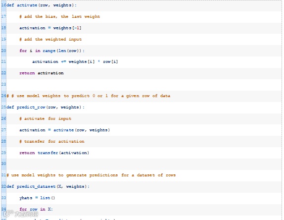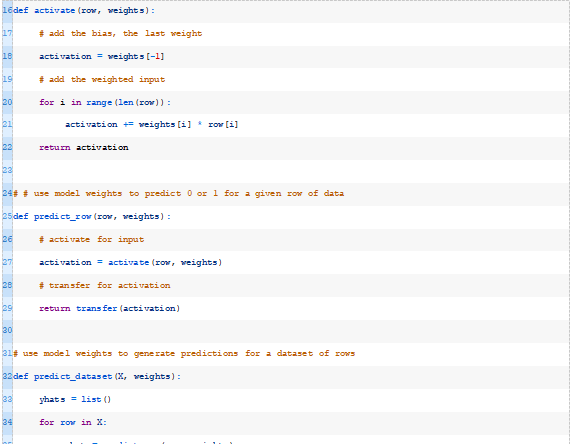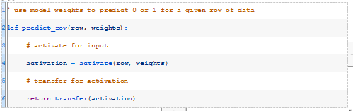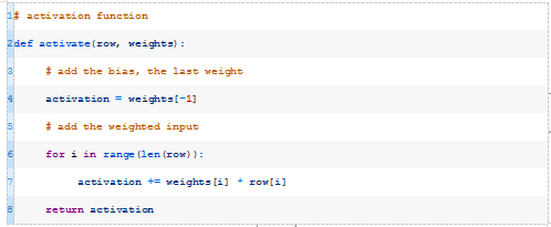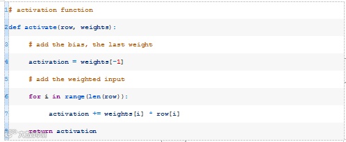此函数将获取模型的数据行和权重,并计算输入的加权和以及偏差权重。下面的activate()函数实现了这一点。