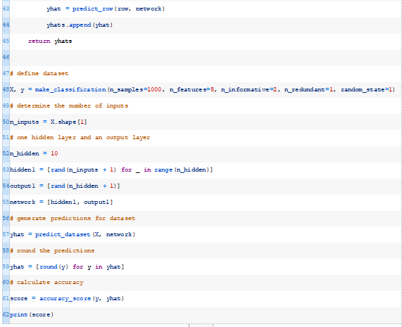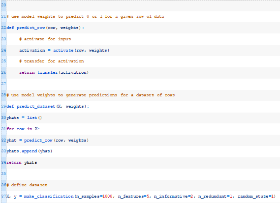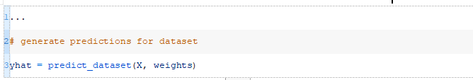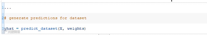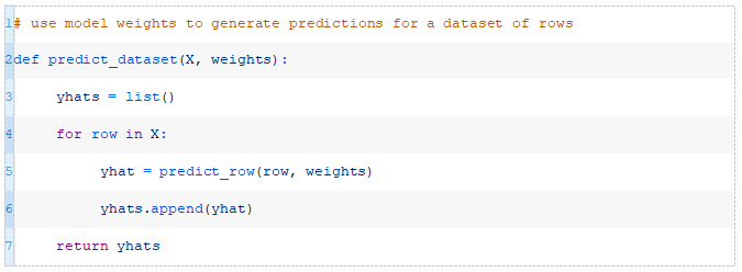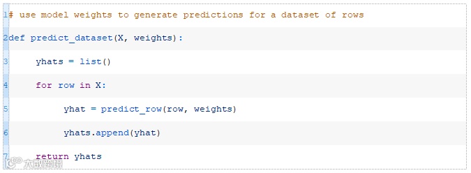 接下来,我们可以为给定数据集中的每一行调用predict_row()函数。下面的predict_dataset()函数实现了这一点。