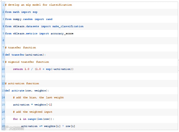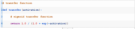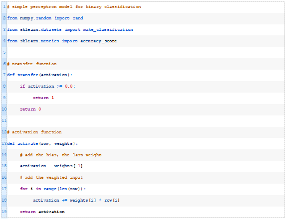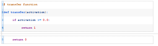 下面的transfer()函数接受模型的激活并返回一个类标签,class=1表示正激活或零激活,class=0表示负激活。这称为阶跃函数。